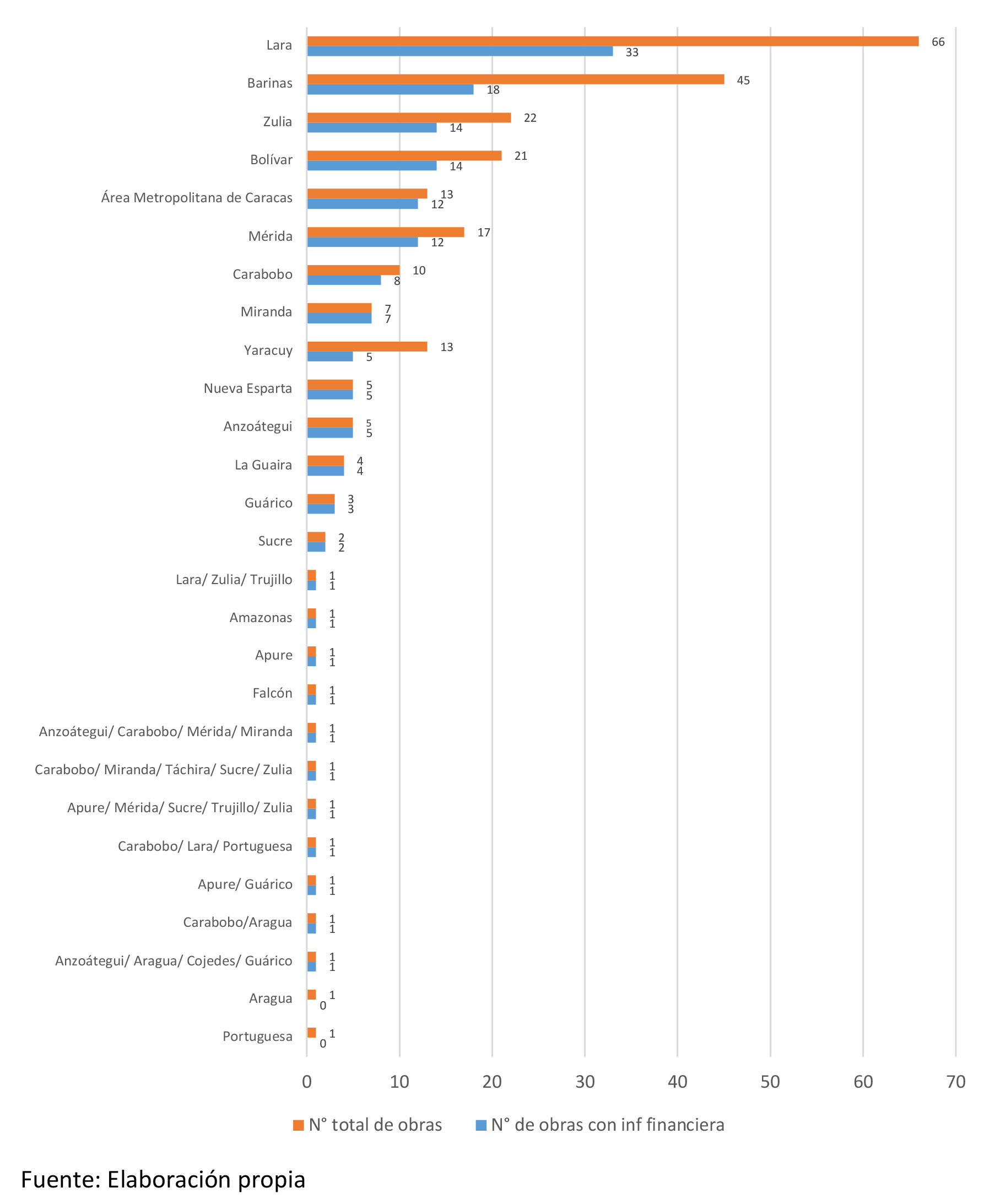 Cabe destacar que, el estado Lara es donde mayor número de obras se registran, un total de 66; pero de la mitad de ellas (33) no se encontró información financiera certera. Seguidamente, se encuentra Barinas con 45 obras, pero solo se halló información de 18. En tercer lugar, el estado Zulia registró 22 obras, con datos de 14, y Bolívar con 21, e información de 14 de ellas.