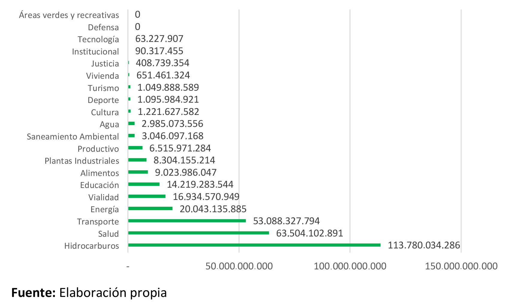 Sin embargo, la distribución sectorial por monto de inversión posiciona al área de hidrocarburos como la de mayores recursos asignados, en obras que no han sido culminadas o no han sido iniciadas. El monto asciende a USD 113.780.034.285. Luego están  los sectores salud, con USD 63.504.102.890, y transporte, con USD 53.088.327.793. Conviene resaltar que entre las obras del sector hidrocarburos, se encuentran el terminal marítimo de Morón, con una inversión de USD 76.382.030.000, cuyos recursos provendrían del financiamiento obtenido con The Export-Import Bank de China (Eximbank); y  el complejo industrial Gran Mariscal de Ayacucho (Cigma), con una inversión de USD 13.000.000.000. Este proyecto contemplaba plantas de licuefacción, industrialización, petroquímica, y hasta facilitaría el procesamiento de los crudos de la faja petrolífera del Orinoco, pero solo se desarrolló el proyecto de la Planta de Acondicionamiento de Gas para el Mercado Interno (PAGMI).