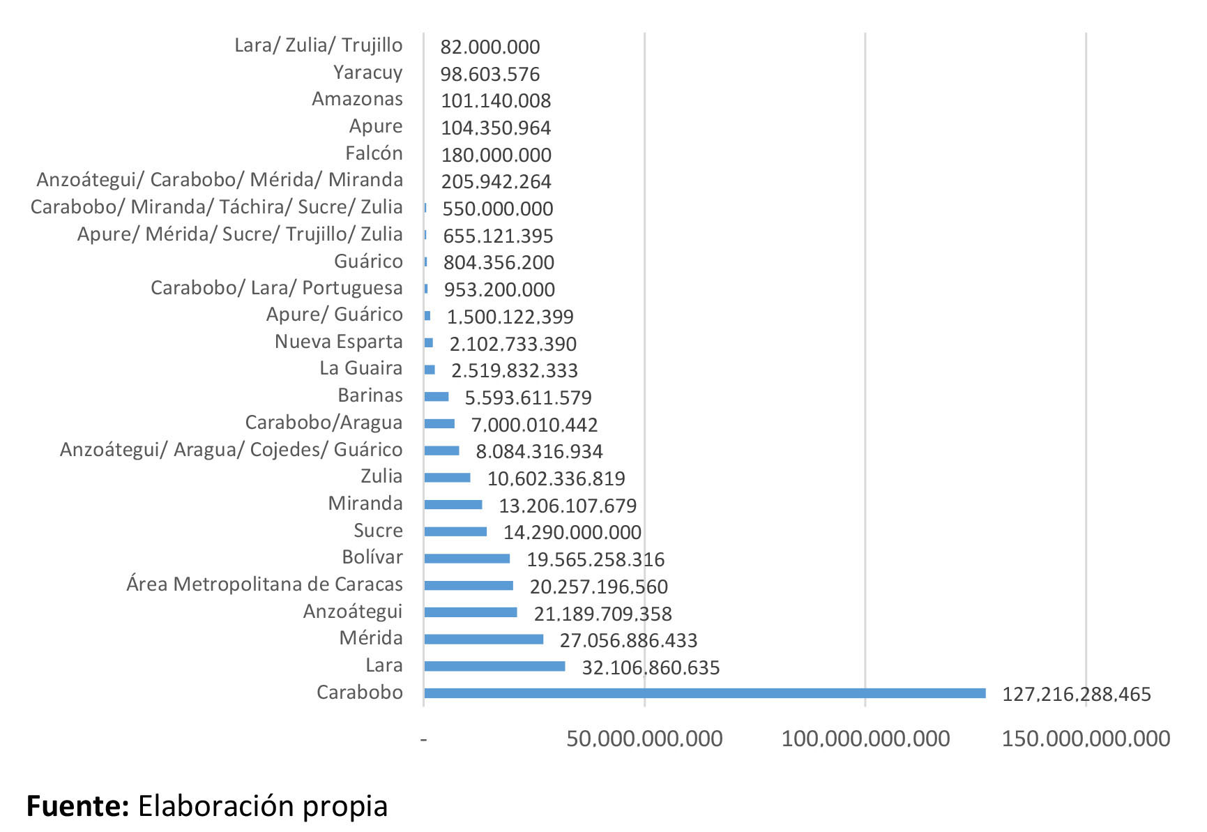 Se registraron obras inconclusas en casi todo el territorio nacional. En primer lugar, se sitúa el estado Carabobo, donde se concentra la mayor inversión conocida de obras no culminadas. El monto asciende a USD 127.216.288.464, distribuidos en ocho (8) obras (40,26% del total). Después se encuentra el estado Lara, donde la inversión en obras no culminadas asciende a USD 32.104.860.634 (10,16% del total), distribuidos en 33 proyectos. En tercer lugar, el estado Mérida cuenta con un monto en inversión de USD 27.056.886.433 (8,56%) que involucra un total de 12 obras (Gráfico 3). Entre estos tres estados se ha invertido 58,98% del total. La proporción de estas inversiones respecto al PIB 2013, año que figura como inicio de la contracción económica del país, es de 42,52%. Se debe tener en cuenta que, existen algunas obras que abarcan varios estados, como por ejemplo el Sistema Ferroviario Ezequiel Zamora II (Puerto Cabello-La Encrucijada), por lo que la inversión por estados es aún mayor,
